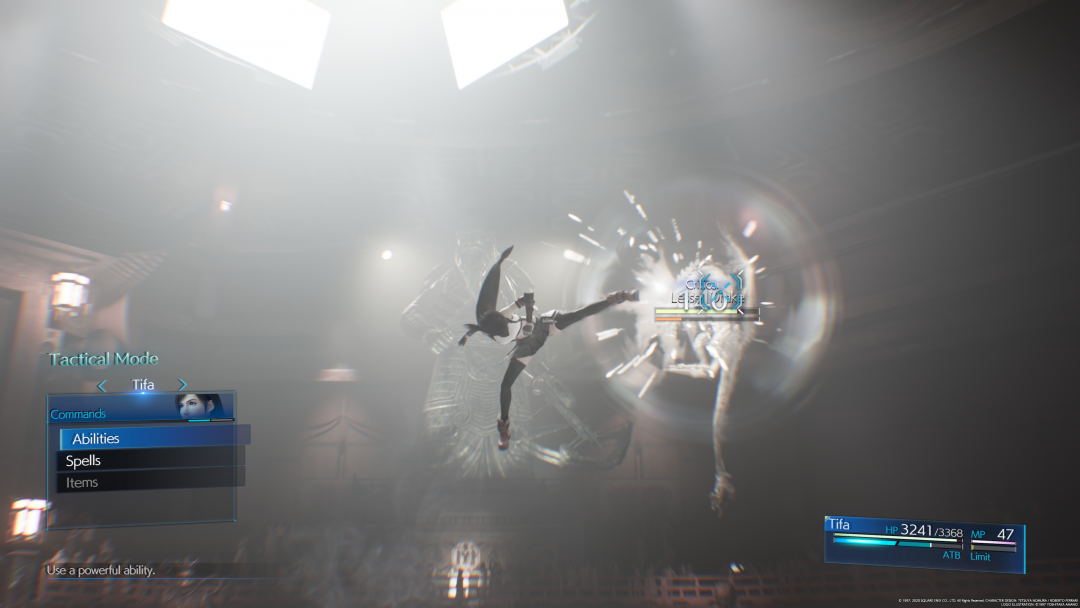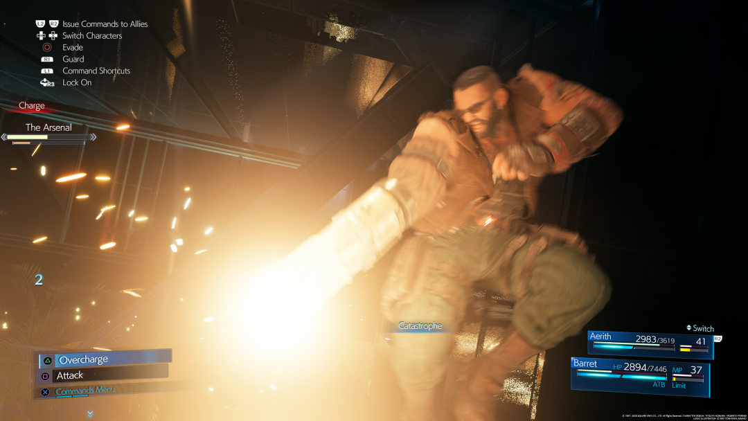 The combat plays out in real-time - you see enemies in the field and it instantly transitions into battle, Cloud pulling the huge sword from his back. Our spiky-haired protagonist has two stances - Operator and Punisher Mode. Operator Mode is for wide swings and damaging multiple enemies while retaining mobility. Punisher Mode turtles you up with the sword facing outwards and allows for more damaging strikes and block counters. You can also bring up a menu to slow time to a crawl as you choose an ability or spell. Every action that isn’t a melee attack, including item use, drains a chunk of your ATB gauge, which you build up by attacking, so you have to juggle between offensive and defensive while keeping your health topped up.